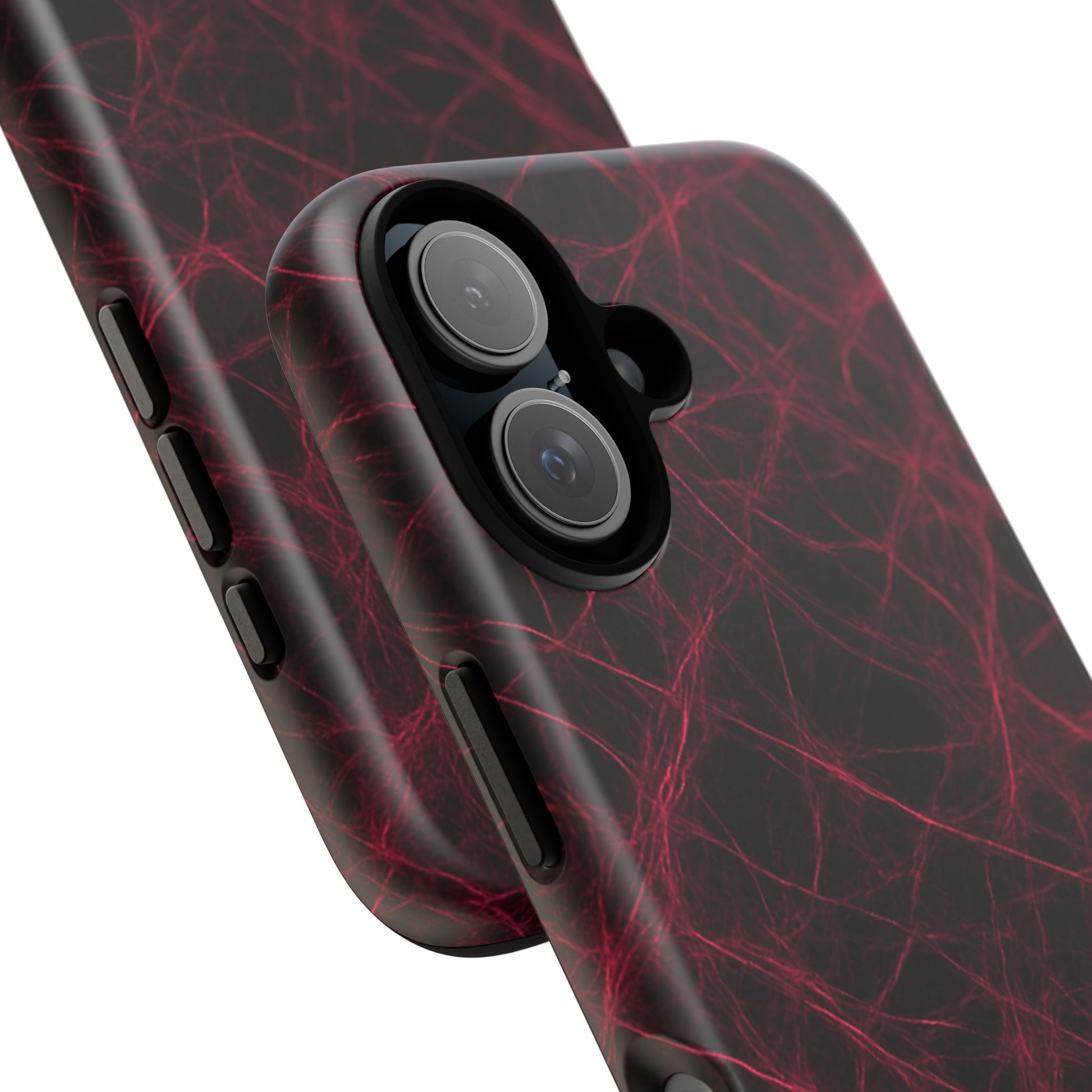 Crimson Synapse knots the surface in red filaments that branch like a neural network over black. It looks like exposed circuitry; it behaves like insulation. Crimson Synapse takes the static so your phone stays clear.